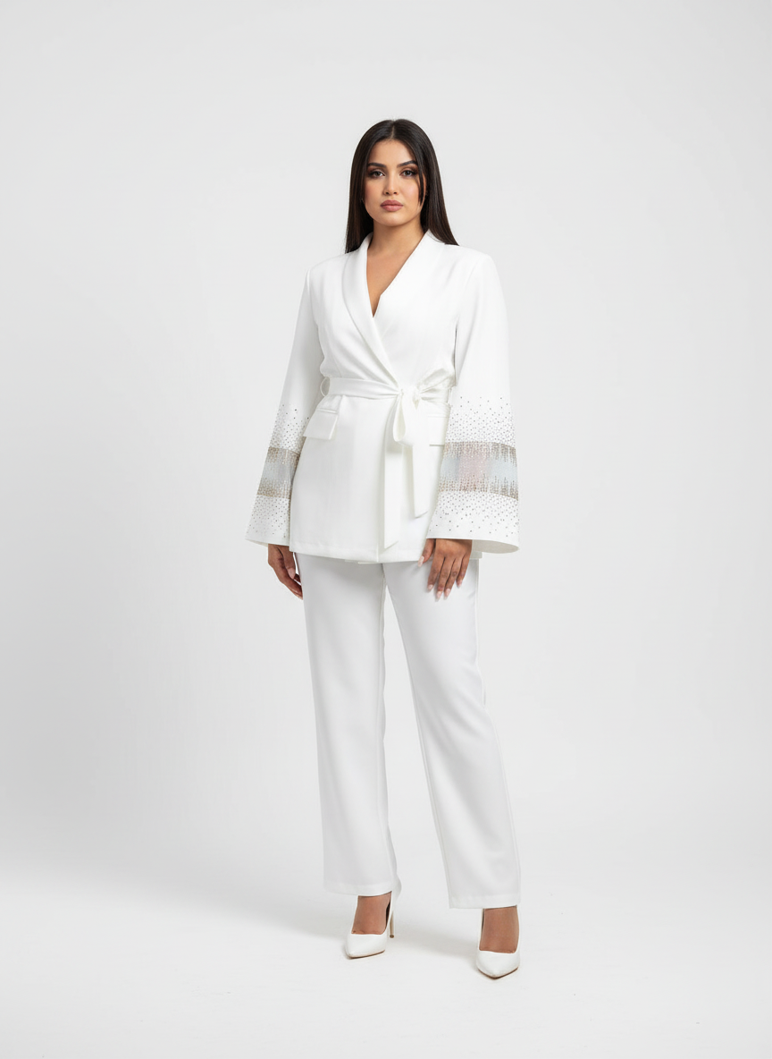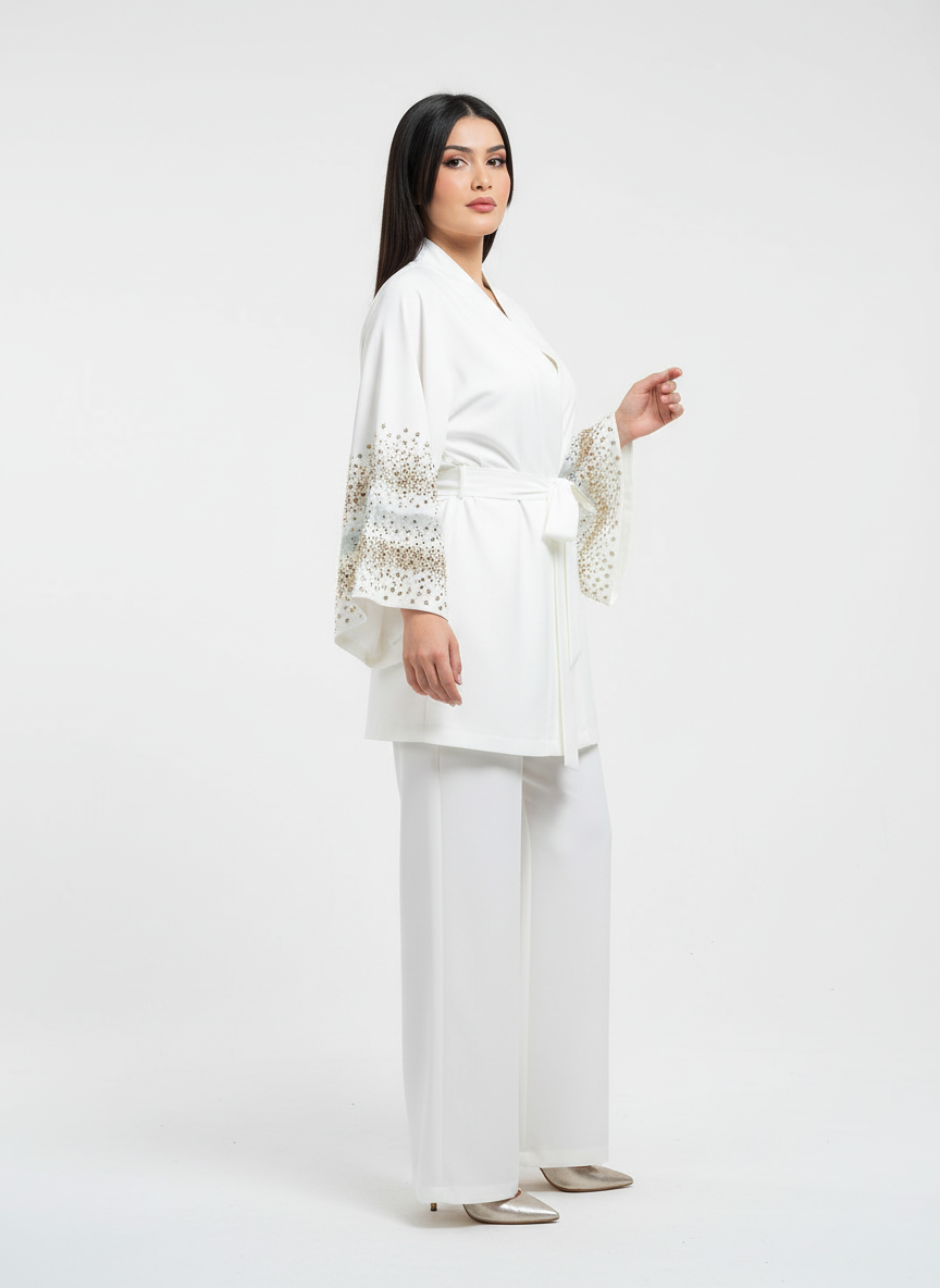 - ✔ أكمام واسعة مزينة بتفاصيل لامعة تضيف لمسة فاخرة وجذابة.